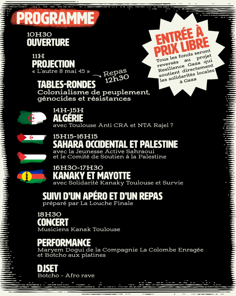 Pour finir, on peut rappeler que les luttes contre les politiques anti-migratoires sont indissociables des luttes anti-impérialistes. Le renforcement de la France en Kanaky, les discriminations à Mayotte et dans ses colonies en général, et la complicité de la France dans la colonisation de la Palestine par l’État sioniste, sont l’application de la politique coloniale française.